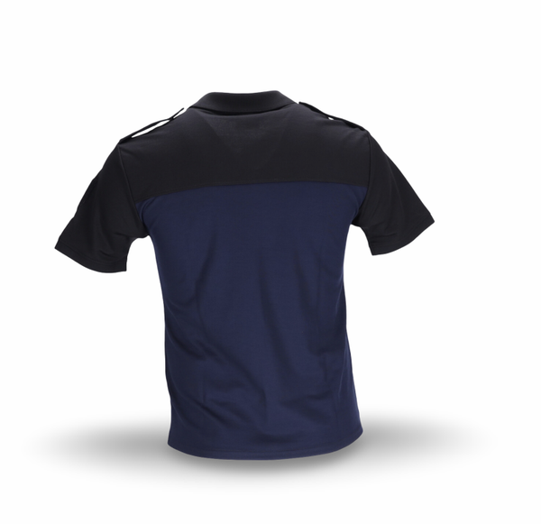 Material: 50 % Baumwolle, 50 % Polyester (hochwertige Piqué-Struktur) · Grammatur: ca. 220 g/m² · Eigenschaften:formstabil, einlaufvorbehandelt, Anti-Pilling, besonders strapazierfähig · Details: 2-farbiges Design (Dunkelblau/Schwarz), weiße Kontrastpaspel, Schulterklappen, Ärmeltasche, 3er-Knopfleiste mit stabilen Druckknöpfen, verstärkte Nähte, Seitenschlitze für optimale Bewegungsfreiheit · Größen: Unisex XS–4XL